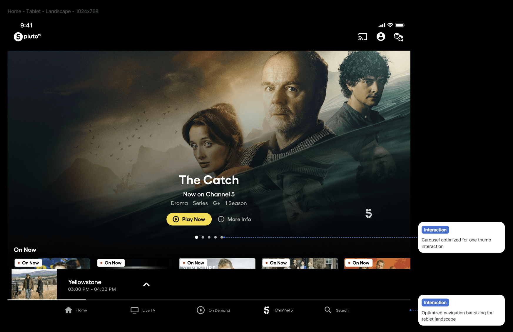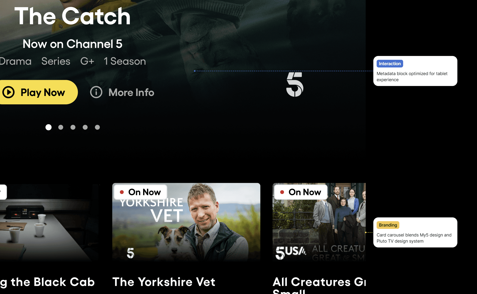 To support a wide range of viewing contexts, I built responsive layouts and interaction patterns across multiple devices and breakpoints, from mobile to connected TVs. A key part of this work was reconciling the existing My5 interface conventions with the Pluto TV design system, aligning visual styles, typography, and interaction models without compromising user familiarity.