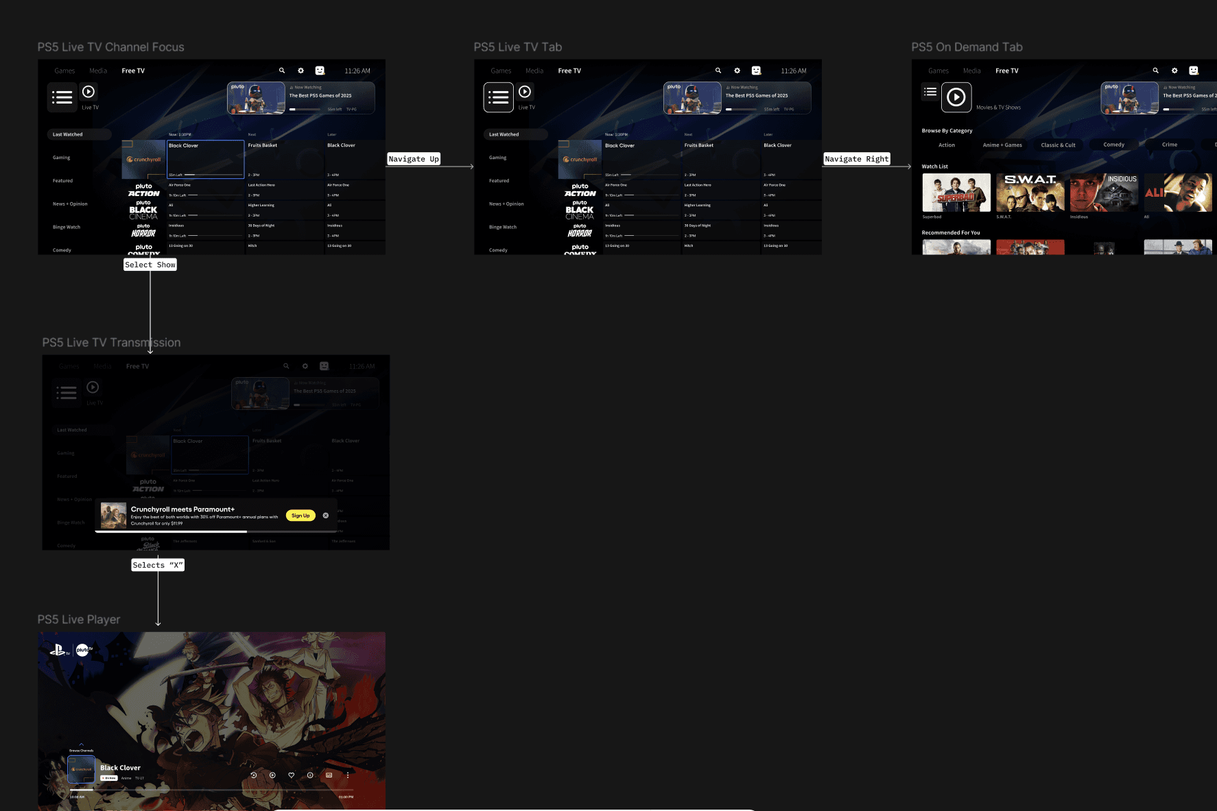 Building on research insights and PS5 UI analysis, I explored multiple user flow concepts to define how Pluto TV could fit seamlessly within the console’s ecosystem. Early sketches helped me visualize different approaches to content entry points, navigation structures, and the balance between lean-back and interactive viewing.